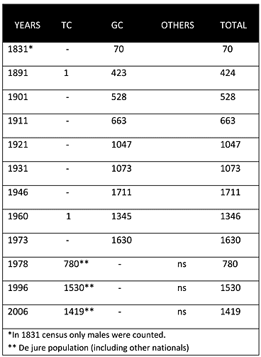 As can be seen from the chart above, from the Ottoman census of 1831 until 1974, Greek Cypriots constituted the sole inhabitants of the village. Throughout the British period, the Greek Cypriot population of the village increased significantly, from 423 in 1891 to 1345 in 1960.