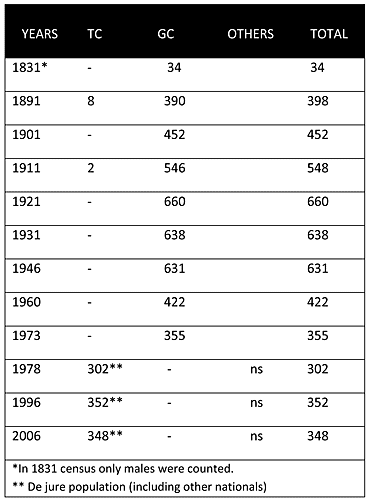 As can be seen from the chart above, in the Ottoman census of 1831 Christians (Greek Cypriots) constituted the only inhabitants of the village. Throughout the British period, the village was almost solely inhabited by Greek Cypriots. Its population steadily increased from 398 in 1891, to 631 in 1946. However, there was a significant drop in 1960 to 422.