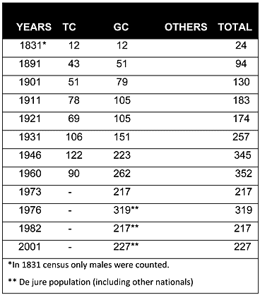 As can be seen in the above chart, the village had a mixed population from the Ottoman period. In 1831 the population percentage of the village was evenly shared by both communities. Throughout the British period, while the Greek Cypriot population increased steadily, the Turkish Cypriot population declined. The Turkish Cypriot proportion of the population decreased from 46% in 1891 to 25% in 1960.